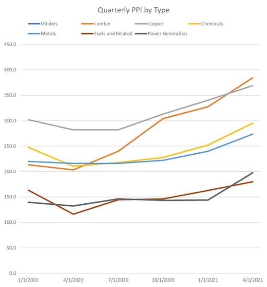 The graph below illustrates the impact of the current inflationary cycle on key commodities in our forecast.