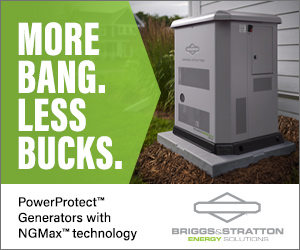 | | Sponsored | | New PowerProtect™ Generators with NGMax™ technology are designed to provide maximum power output using Natural Gas—so homeowners pay a lower cost per kilowatt. View the entire PowerProtect Generator lineup and find the right fit for your customers. |